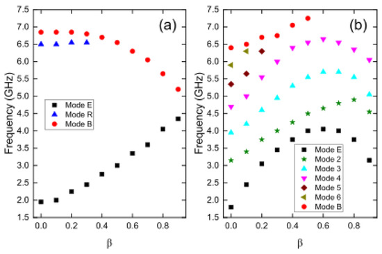 Evolution of resonance modes for 1000 nm long Fe3O4 nanotubes with external radius (a) Rext = 30 nm and (b) Rext = 80 nm, as a function of the parameter β.
