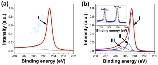 The C 1s and Ag 3D X-ray photoelectron spectroscopy data of the pristine (a) and silver-filled SWCNTs (b). The roman numbers denote the components of the spectra. M. V. Kharlamova et al. Donor doping of single-walled carbon nanotubes by filling of channels with silver, Journal of Experimental and Theoretical Physics, V. 115, № 3, pp. 485–491, 2012, reproduced with permission from SNCSC [19].