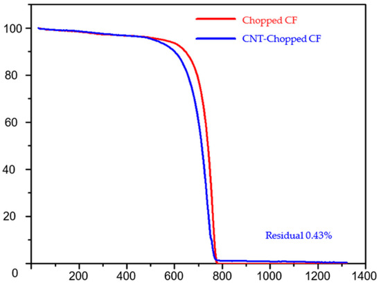 Thermogravimetric analysis data for chopped carbon fiber (CF) and CNT-integrated chopped fiber. Reprinted from Ref. [6]. Copyright 2023 by the authors. Licensee MDPI, Basel, Switzerland. This article is an open access article distributed under the terms and conditions of the Creative Commons Attribution (CC BY) license.