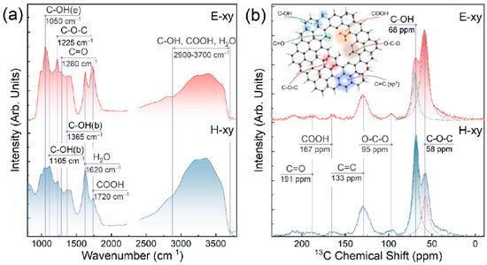 (a) Fourier–transformed infrared (FT–IR) spectra and (b) solid–state 13C nuclear magnetic resonance (NMR) spectroscopy of E–xy and H–xy graphenes, and schematics of graphene chemistry. Reprinted from Ref. [7]. Copyright 2022 by the authors. Licensee MDPI, Basel, Switzerland. This article is an open access article distributed under the terms and conditions of the Creative Commons Attribution (CC BY) license.