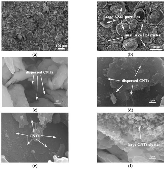 The SEM images of CNTs/AZ61 composites: (a,b) low-magnification images, (c) 0.5% CNTs, (d) 0.75% CNTs, (e) 1% CNTs, and (f) 1.25% CNTs. Reprinted from Ref. [9]. Copyright 2022 by the authors. Licensee MDPI, Basel, Switzerland. This article is an open access article distributed under the terms and conditions of the Creative Commons Attribution (CC BY) license.