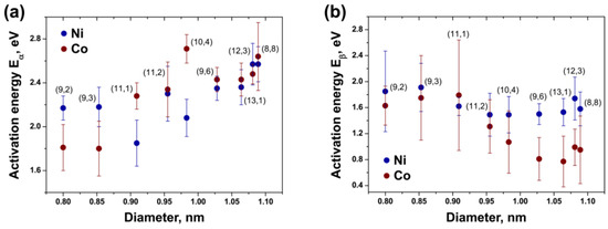 The dependence of activation energy Eα (a) and Eβ (b) of growth of inner SWCNTs on diameter for nickelocene- and cobaltocene-filled SWCNTs. The chiralities of inner tubes are labelled. Reprinted from Ref. [16]. Copyright 2021 by the authors. Licensee MDPI, Basel, Switzerland. This article is an open access article distributed under the terms and conditions of the Creative Commons Attribution (CC BY) license.