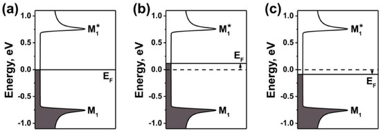 The schematics of the band structures of metallic SWCNTs (EF is the Fermi level and M1, and M1* are van Hove singularities) (a), upshift (b), and downshift (c) of the Fermi level of treated SWCNTs. Reprinted from Ref. [17]. Copyright 2021 by the authors. Licensee MDPI, Basel, Switzerland. This article is an open access article distributed under the terms and conditions of the Creative Commons Attribution (CC BY) license.
