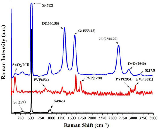 Raman spectra of ox-SWCNH-SnO2-PVP with stoichiometry 1/1/1. Reprinted from Ref. [18]. Copyright 2020 by the authors. Licensee MDPI, Basel, Switzerland. This article is an open access article distributed under the terms and conditions of the Creative Commons Attribution (CC BY) license.