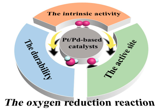 At present, the research focus regarding PGMs is to synthesize a catalyst with better performance in order to reduce the load of PGMs and their cost. Several reviews have been reported to summarize catalyst synthesis methods and structure–activity relationships. Considering that significant progress towards Pt/Pd-based ORR catalysts has been achieved, but with no systematic summary of the performance enhancement mechanism, this review focuses on the performance improvement strategy and mechanism of Pt/Pd-based catalysis. Firstly, the intermediate products and reaction processes in the ORR process are introduced, the factors affecting the catalytic kinetics and mechanisms are discussed, and the main ideas to improve the catalytic performance of the catalyst are summarized as increasing the intrinsic activity, the number of active sites and the durability. (Figure 1) Then, combined with the above theory, we focus on the recent progress in the synthesis of Pt/Pd-based catalysts and analyze the reasons for their excellent performance. Finally, we discuss the current barriers and challenges of Pt/Pd-based catalysts and give our own suggestions for overcoming these barriers.