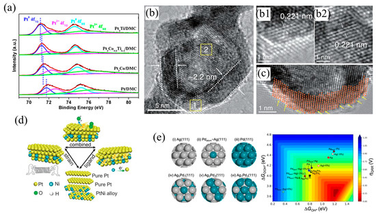 (a) Pt 4f XPS spectra of Pt3Co1−xTix and Pt/DMC. Reprinted with permission from Ref. [39]. Copyright 2022, ACS Catalysis. (b) Enlarged TEM image and (b1,b2) the corresponding HRTEM images of the areas marked by yellow squares. (c) Atomic-resolution HRTEM image in the edge of Pt–Ni nanocages. (d) Illustration of the synergistic effects derived from both the lattice strain and ligand effects in the catalysts. Reprinted with permission from Ref. [19]. Copyright 2019, Nature. (e) Ag-Pd active site models investigated by DFT for their effect on ORR activity and oxygen reduction reaction (ORR) activity map showing overpotentials. Reprinted with permission from Ref. [30]. Copyright 2021, Nature Communications.