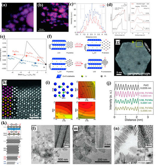 Elemental maps (a,b) and line profiles (c) of Pt−Cu bimetallic nanoparticle precursors and dealloyed active catalysts. (d) Surface science XAS and XES studies of single-crystal model systems that mimic dealloyed bimetallic core–shell structures. (e) Experimental and predicted relationships between electrocatalytic ORR activity and lattice strain. Reprinted with permission from Ref. [40]. Copyright 2010, Nature Chemistry. (f) Schematic of the lattice constant change in LixCoO2 substrates and how the lattice strains are induced to Pt NPs. Reprinted with permission from Ref. [35]. Copyright 2016, Science. (g) HAADF-STEM image from out-of-plate view. (h) High-resolution HAADF image from the selected area in (g). (i) DFT calculations of oxygen adsorption energy. Reprinted with permission from Ref. [41]. Copyright 2016, Science. (j) The intensity profile and calculated average d-spacing of (111) planes. (k) Mechanism of the generation of intrinsic strain in 2D transition metal nanosheets. h is the height of an atomic layer. (l–n) TEM images of as-prepared Pd nanosheets (NSs) with average thicknesses of 3 ML (k), 5 ML (l), and 8 ML (m), with insets depicting typical structures. Reprinted with permission from Ref. [42]. Copyright 2019, Science.