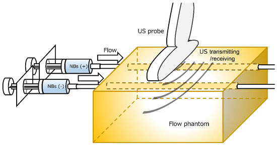 Flow phantom and measurement set up to characterize regenerated NBs with ultrasound. NBs (+): solution with nanobubbles; NB (−): solution without nanobubbles.