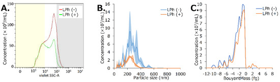 Characteristic changes of bubbles in solution before and after lyophilization. (A) Comparison of bubble concentration and size distribution using flow cytometry (FCM) analysis. (B) Comparison of bubble concentration and particle size using nanoparticle tracking analysis (NTA). (C) Comparison of bubble concentration and buoyant mass using Resonance Mass Measurement (RMM) analysis. LPh (−): solution before lyophilization; LPh (+): solution after lyophilization.