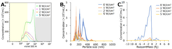 The NB solution regenerated from lyophilized material was irradiated with US. US irradiation intensities of 1, 2, and 5 W/cm2 reduced the concentration of NBs from 6.3 × 108/mL to 2.1 × 108/mL (33.3%), 1.6 × 108/mL (24.7%), and 9.9 × 107/mL (15.7%), respectively, according to FCM analysis (Figure 6A, Table A2). The concentrations decreased from 2.0 × 108/mL to 7.1 × 107/mL (34.7%) for NBs < 200 nm in diameter, from 4.0 × 108/mL to 2.5 × 107/mL (6.2%) for NBs 200–500 nm, and from 2.2 × 107/mL to 2.5 × 106/mL (11.3%) for NBs >500 nm, using an intensity of 5 W/cm2.