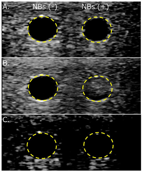 Diluted solutions with and without NBs regenerated from the lyophilized material were refluxed into a flow phantom vessel to observe their echogenicity. Changes in the echo brightness in the vessel due to solution perfusion, with or without NBs, could not be detected using B-mode imaging alone (Figure 7A). An increase in brightness was detected only in the perfusion of solutions containing NBs using CHA (Figure 7B). No increase in brightness was observed with or without NBs in the solution using AM (Figure 7C).