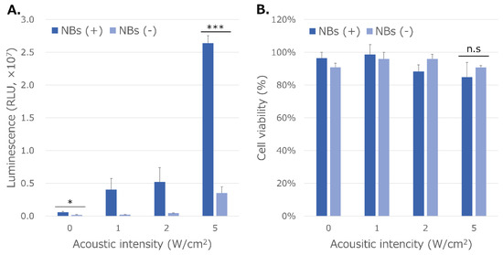 mRNA transfection efficiency (A) and cell viability (B) by sonoporation using NBs regenerated from lyophilized material. NBs (+): solution with nanobubbles, NBs (−): solution without nanobubbles. (* p < 0.05; *** p < 0.001; n.s: not significant) (N = 3).