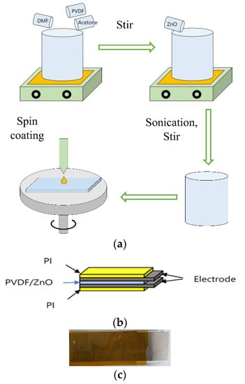 Firstly, Acetone (Daejung Co., Busan, Republic of Korea) and N, N-Dimethylformamide (DMF, Daejung Co., Republic of Korea) were employed as the solvents, while Poly (vinylidene fluoride) pellets (Mw 180,000 by GPC) were purchased from Sigma Aldrich Co. (St. Louis, MO, USA) ZnO nano-powder was purchased from Duskan pure chemicals, Korea, with an average particle size of about 15 nm.