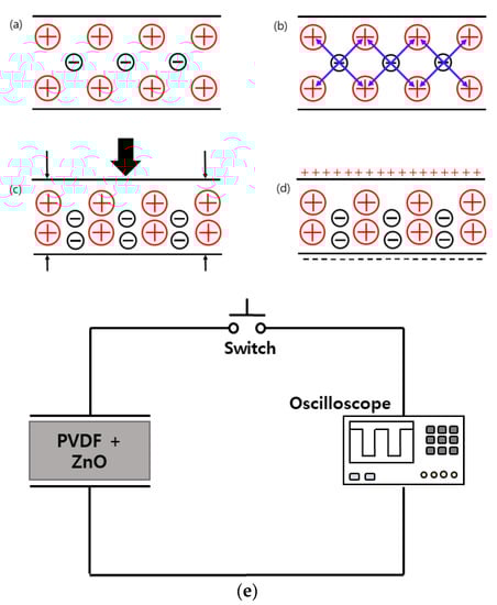 (a–d) Working principal of piezoelectric sensor, (e) electrical setup of nanogenerator with oscilloscope.