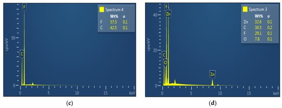 Powerful analytical methods such as energy-dispersive spectroscopy (EDS) were used to identify the elements present in a sample. By blasting the sample with high-energy electrons, which causes the emission of distinctive X-rays, the EDS spectrum is acquired. These X-rays’ energy are measured and utilized to determine the elements that are present in the sample. The strength of the peaks in the EDS spectrum indicates the relative quantity of each element in the sample and corresponds to the distinctive X-ray peaks of the elements present in the sample. The elemental makeup of materials and the presence of trace elements or contaminants in our sample were both identified using the EDS spectrum. To conform the composite formation of the prepared films, the energy-dispersive spectroscopy (EDS) spectrum is also provided in Figure 4c,d, where it shows uniform distribution of the proper concentration based on composite mixture. The composition of PVDF and PVDF/ZnO is formed reflecting individual particle ratios, according to the EDS spectra. To produce nanocomposite, which constitutes spin coated films with a consistent structure and 15% ZnO, the optimal production parameters have to be met.