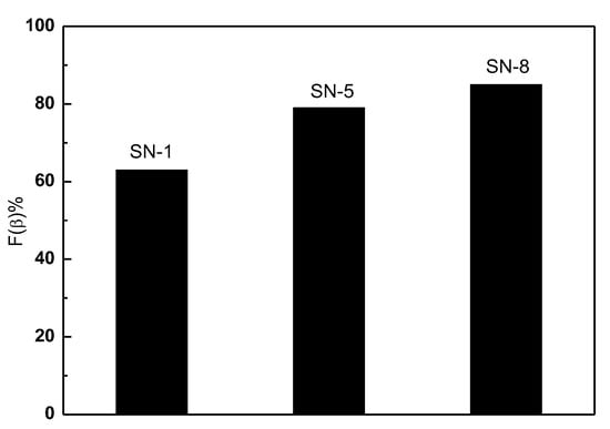 Here, Aα and Aβ is the absorbance of α and β phases at 763 cm−1 and 840 cm−1, respectively. Kα and Kβ stand for the absorption coefficients, with respective values of 6.1 × 104 and 7.7 × 104 cm2mol−1. Figure 7 shows a bar chart representation of the evaluated F(β). It is found that the F(β) of PVDF nanofibers can be enhanced by adding ZnO nanoparticles. In addition, the PVDF/ZnO (SN-8) nanocomposite film exhibits a higher F(β) value (85%) than the only PVDF film (63%). The surface of nanoparticles with a negative charge density and the CH2 groups of the PVDF chains with a positive charge density effectively interact to cause the nucleation of the β-phase crystallite in nanoparticles doped PVDF composite [55,56].