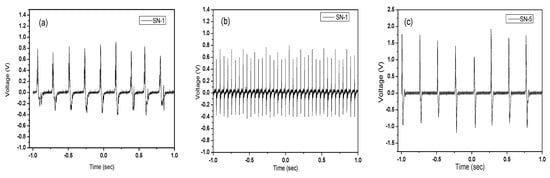 The extraction of open-circuit voltage occurred as follows: (1) a mechanical force was applied to the nanogenerator, causing it to produce an electrical charge; (2) the charge built on the electrodes of the gadget, causing a potential difference between them; and (3) the device’s open-circuit voltage, or the voltage produced when there is no load attached to the device, was then measured using the oscilloscope. To achieve an average value and guarantee that the results were repeatable, the open-circuit voltage was usually tested numerous times. To thoroughly assess the performance of a PVDF-ZnO piezoelectric nanogenerator, measurements of short-circuit current, power output, and energy conversion efficiency may also be made in addition to open-circuit voltage. Similar experimental configurations and measurement methods to those previously mentioned can be used to derive these parameters.