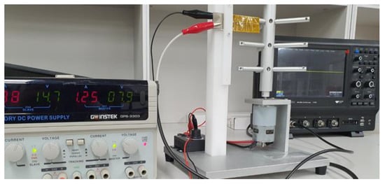 The experimental setup worked as follows: (1) a PVDF film was coated with a combination of ZnO nanoparticles utilizing spin coating processes to create the PVDF-ZnO nanogenerator; (2) the nanogenerator was fastened to a hitting machine and tiny iron rods struck it with a mechanical force provided by a dc motor; and (3) a 12 V laboratory dc power source powered the dc motor. Moreover, while the nanogenerator was on the table and being pressed by hand, the voltage generated from it was monitored. An oscilloscope with a high impedance (100 MΩ) voltage probe was used to measure the device’s electrical output by connecting two opposed electrodes to the oscilloscope’s opposite terminal (see Figure 3e).