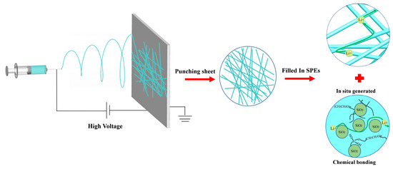 As an advanced preparation method of PEO-based SPEs, electrostatic spinning is expected to achieve a unique 3D network structure of nanofiber composite electrolyte [27]. This structure not only provides a one-dimensional ion transport channel to accelerate the conduction of lithium ions [28,29,30,31], it also improves the mechanical strength of the electrospun electrolytes [32,33].