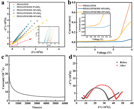 (a) Nyquist plots and (b) linear sweep voltammetry of the as-spun SPEs at 60 °C, (c) DC polarization, and (d) EIS curves of PEO/LiTFSI/ISF-10%SiO2 at 20 °C.