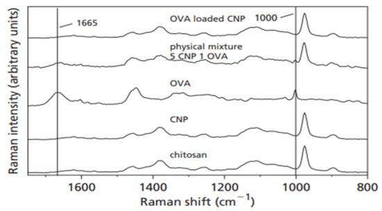 Raman spectroscopy is a sensitive technique used to detect the structural modifications in macromolecular complexes, as deduced from the excitation of the associated Raman-active vibrational modes [63]. The Raman effect is based on the scattering of light, which includes both elastic scattering at the same wavelength as the incident light and inelastic scattering at a shifted wavelength, which is due to the excitation of a specific molecular vibration. In a study by Gordon et al. [64], Raman spectroscopy was used to test whether the adsorption of ovalbumin (OVA) to CNPs caused conformational changes to the protein. As shown in Figure 3, the Raman spectrum measured from OVA-loaded CNPs differs either from the spectra of the two individual components or from the spectrum of a simple physical mixture of the two components, demonstrating a conformational change in the OVA protein upon loading. The resultant hydrogen bonding, ion–ion, and ion–dipole interactions account for the conformational alteration of OVA. As demonstrated by Yamasaki et al., more subtle effects can be observed in the Raman spectra as a result of conformational changes, including frequency shifts, intensity changes, and line broadening of the pertinent Raman bands [65]. There is evidence for conformational modifications to vaccines having a direct bearing on the immune response of a host [66].