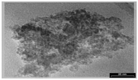 TEM can be used to study the degree of crystallinity, size, and morphology of nanoparticles. TEM uses a beam of focused high-energy electrons that transmits the specimen, whereby the resulting image can be viewed on an imaging system (i.e., phosphor screen) situated on the opposite side of the impinging electron beam. The image results from the interference between the electron beam that is transmitted through the sample and the beam that is diffracted from the sample. Typically, high resolution TEM imaging is possible to a length scale on the order of 2 Å. For TEM analysis, the sample needs to be very thin (~500 Å or less) to produce a high-resolution image [35]. TEM specimens can be prepared by using a negative staining material (e.g., uranyl acetate) or by the simple deposition of a dilute suspension of the sample on a carbon-coated copper grid. In a study by Ghadi et al. [67], TEM was used to analyze the magnetic chitosan nanoparticle’s shape and particle size. As shown in Figure 4, the Fe3O4 particles used in the study were coated well with chitosan and the diameter of CNPs ranged from 10 to 80 nm [67].
