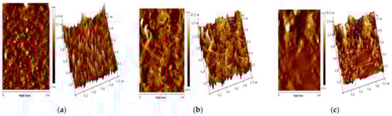 Atomic force microscopy image of (a) chitosan thin film, (b) Fe2O3 thin film, (c) and a composite chitosan/Fe2O3 thin film [68].