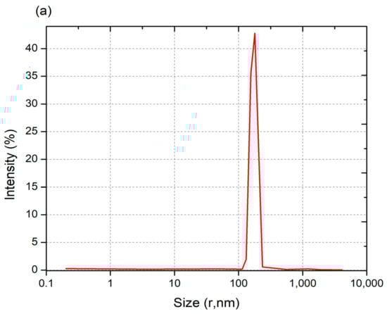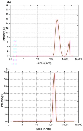 Through detection of the scattered light intensity, the DLS technique enables the measurement of the dynamic fluctuations of particles stemming from their Brownian motion in a solution. The light source is monochromatic and is typically from a laser, and the particles in the solution produce a dynamic diffraction of light in a speckel pattern. The average particle size within a sample can be determined using the Stokes–Einstein equation. In addition, DLS enables the determination of the polydispersity of nanoparticles within a sample (i.e., the polydispersity index (PDI)), or the dispersity in the new convention as recommended by the IUPAC, and their Zeta potential. The use of the DLS technique for nanoparticle size determination typically requires monitoring intensity variations at various detector angles for several polarizations relative to the incident light [74,75]. In a study by Fan et al. [76], DLS was performed on CNPs, saponin-CNPs, and Cu-CNPs at a light-scattering angle of 90°. The size distribution profiles are shown in Figure 6a–c: the authors report that, based on these measurements, the mean diameter and the PDI or dispersity values of CNPs, saponin-loaded CNPs, and Cu-loaded CNPs were ~192 nm and 0.6, ~374 nm and 1.0, and ~196 nm and 0.5, respectively [72]. The lower PDI values show that the CNPs and Cu-CNP nanoparticles have narrower size distributions than the saponin-CNPs. The authors reported that the CNP and Cu-CNP samples had larger Zeta potential values, of +45.33 and +88 mV, respectively, compared to the value reported for saponin-CNPs (+31 mV) [73]. The Zeta potential, which is a measure of the electric potential between the attached and non-attached fluid with respect to the nanoparticle surface, is a measure of the stability of nanoparticles in the fluid. Therefore, the CNP and Cu-CNPs, having larger Zeta potential values, exhibit higher stability than saponin-CNPs in an aqueous media [77]. In a study by Lu et al. [78], CNPs loaded with DNA and grafted with polyethylenimine (PEI) were prepared for gene therapy for osteoarthritis. Using DLS to measure the dispersity and Zeta potential, the authors reported that particle size decreased, whereas surface charge increased (i.e., larger Zeta potential), as the CNP:DNA weight-to-weight ratio increased.