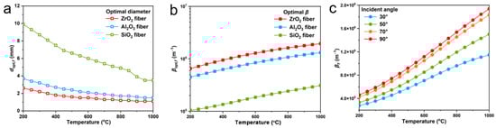 The radiative properties of three fibers. (a) Optimal cylinder diameter of various fibers. (b) Optimal temperature-dependent extinction coefficient of fibers based on the optimal diameter. (c) Temperature-dependent extinction coefficient of ZrO2 fibers against angle between fiber axis and incident radiation.