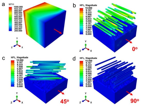 The heat conduction properties of ZrO2 fibers network. (a) Temperature gradient vector of RVE. The angles between fiber axis and temperature gradient vector are (b) 0°, (c) 45° and (d) 90°.