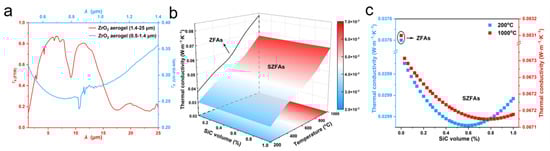 According to Equation (9), kr is proportional to T3 and increases dramatically with temperature, causing radiation become the dominant heat transfer mode at high temperatures. Therefore, to suppress the thermal radiation inside the ZrO2 fiber aerogels, it is necessary to dope opacifier particles to further enhance the aerogel shading performance. Among several common ceramics (ZrO2, TiO2 and SiC), SiC exhibits superior extinction properties and is therefore chosen as an opacifier in this work [33]. However, doping SiC opacifiers in ZrO2 fiber aerogels will also inevitably increase the solid heat transfer. Thus, there exists an optimal SiC amount that can well balance the radiative and solid heat transfer, achieving a minimum value of thermal conductivity for aerogels. Firstly, the spectral transmittance of ZrO2 fiber aerogels (ZFAs) is measured based on UV-VIS-NIR spectrophotometer and FTIR measurements in the spectral range of 0.5–25 μm (Figure 3a). Then, the temperature-dependent radiative thermal conductivity of SiC opacifiers doped-ZrO2 fiber aerogels (SZFAs) is calculated for a wide range of doping volume fractions (0–1%) based on the spectral transmittance of ZFAs, and the optimal doping volume fraction of SiC opacifiers is obtained. The results show that the effective thermal conductivity of SZFAs decreases significantly after being opacified with SiC particles (Figure 3b,c), indicating that the radiative transmission could be well restrained by SiC opacifiers. And the optimal doping volume fraction of SiC opacifiers gradually increases from 0.59% at 200 °C (corresponding to mass fractions between 30 and 40%) to 0.78% at 1000 °C (corresponding to mass fractions between 40 and 50%), which provides a guide for subsequent material preparation.