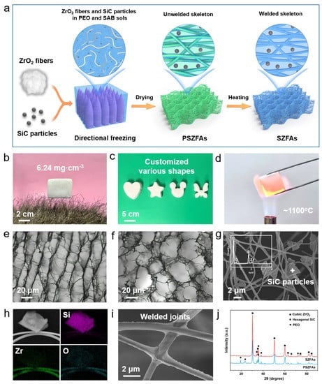 (a) Schematic diagram of the preparation process of SZFAs. (b) Macroscopic photograph of SZFAs standing on artificial hairs. (c) Customized SZFAs with different shapes. (d) SZFAs heated by 1100 °C flame without damage. Microscopic photographs of SZFAs in (e) radial and (f) axial directions. (g) SEM image of SZFAs and EDS pattern of SiC particles. (h) EDS mapping images of Si, Zr and O elements in SZFAs. (i) SEM image of inter-fiber welded joints. (j) XRD patterns of PSZFAs and SZFAs.
