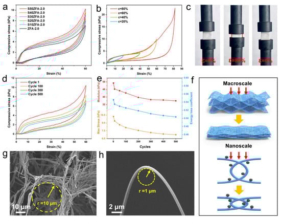 (a) Stress–strain curves (60% strain) for ZFA-2.0 and SZFAs with different SiC contents. (b) Stress–strain curves of S50ZFA-2.0 at different strains. (c) Photograph of the compression process of S50ZFA-2.0 (80% strain). (d) Compression cycle curves of S50ZFA-2.0 (60% strain, 500 cycles). (e) Curves of elastic modulus, maximum stress, and energy loss coefficient with increasing compression cycles. (f) Schematic of the elastic deformation mechanism. Curvature radius of (g) a single honeycomb structure and (h) a single fiber.