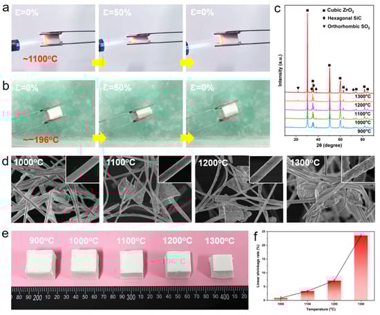 In situ compression experiments in (a) butane torch (~1100 °C) and (b) liquid nitrogen (~−196 °C). (c) XRD patterns of S50ZFA-2.0 after heat treatment at different temperatures. (d) SEM photographs and enlarged views of fibers (inset) of S50ZFA-2.0 after heat treatment at different temperatures. (e) Macroscopic photographs and (f) linear shrinkage rate of S50ZFA-2.0 after heat treatment at various temperatures.