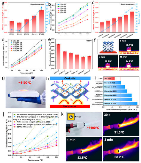 (a) Density and room temperature thermal conductivity as well as (b) high-temperature thermal conductivity of ZFAs with different fiber contents. (c) Density and room temperature thermal conductivity as well as (d,e) high-temperature thermal conductivity of SZFAs with different SiC contents. (f) Hot table heating experiment of S50ZFA-2.0 (300 °C). (g) Superior thermal insulation performance of S40ZFA-2.0 for protecting a hand (heated for 1 min) from damage under 1100 °C flame. (h) Schematic of high-temperature superinsulation mechanism of S50ZFA-2.0. (i) Comparison of high-temperature thermal conductivity of SZFAs with the reported ZrO2-based fiber aerogels at 1000 °C [24,57,58,59,60,61]. (j) Comparison of high-temperature thermal conductivity between SZFAs and reported fiber aerogels [9,15,16,21,24,57,60,61,62]. (k) Demonstration experiment of high-temperature thermal superinsulation performance of SZFAs.