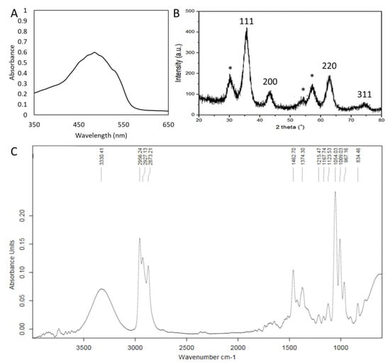 Characterization of GS-AgNP-LEPN. Representative (A) spectrum of UV–Visible absorbance in the wavelength range of 350–650 nm, (B) XRD spectrum, and (C) FT–IR spectrum of GS-AgNP–LEPN.