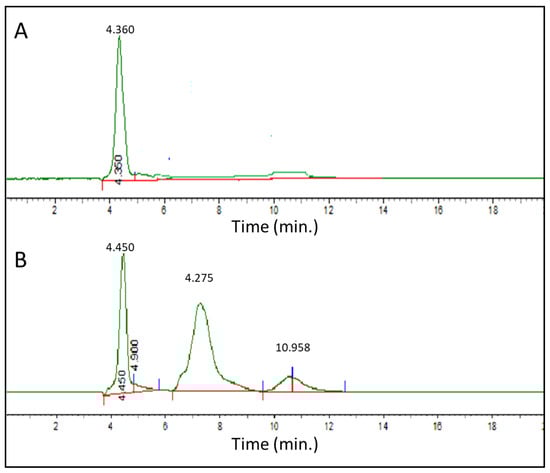 To understand which chemical constituents are potentially responsible for the biological activity, the quantitative analysis of LEPN was performed by using HPLC. Previous studies have reported that phyllanthin is one of the primary chemical constituents with biological activity [72,73,74]. Therefore, we analyzed LEPN by HPLC and compared it with that of a standard phyllanthin. Our HPLC results showed a symmetrical peak for standard phyllanthin at the retention time of 4.36 min (Figure 3A). Three other peaks were found: one at 4.450 min corresponding to phyllanthin and two additional peaks at 7.275 min and 10.958 min, suggesting the presence of other constituents (Figure 3B). Of the two additional peaks, the peak around the retention time of 11 could be due to nirurinetin based on the comparison with a previous report [75].