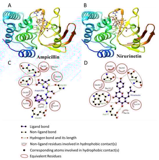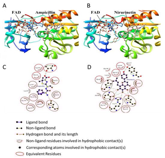 Molecular docking analysis of ampicillin and nirurinetin with FAD-containing ferredoxin-NADP reductase. (A,B) The binding pattern of (A) ampicillin and (B) nirurinetin with an FAD-containing ferredoxin-NADP reductase active site pocket. Ligands are represented in the ball & stick model and active site pocket of NADP reductase in the surface & ribbon structure. Nirurinetin exhibited a binding pattern like ampicillin. (C,D) Assessment of H-bonding and hydrophobic interaction pattern of (C) ampicillin and (D) nirurinetin with FAD-containing ferredoxin-NADP reductase active site pocket.