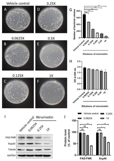 Effect of nirurinetin on the protein level of FAD-FNR and XopAI in X. axonopodis and its bacterial growth. (A–H) Representative images showing the effect of different dilutions of nirurinetin on the growth of X. axonopodis pv. and their quantitative bar graphs. (I,J) Representative immunoblots showing the effect of different dilutions of nirurinetin on the growth of X. axonopodis pv. and their quantitative bar graphs. Data in (G,H,J) are presented as the mean ± SEM (N = 3). Vehicle control vs. different concentrations of nirurinetin; * p < 0.05, ** p < 0.01, ns = not significant.
