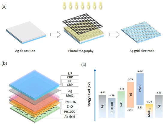 (a) Schematic diagram of the manufacturing process of Ag grid electrodes; (b) Schematic device structure of the Ag grid ST-OSCs and (c) the corresponding energy level diagram.