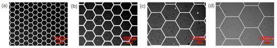 Ag grid electrode images with different pitches (a) 100 μm; (b) 200 μm; (c) 300 μm; (d) 400 μm.