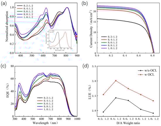 (a) The effect of mixed films with different D: A ratios on absorption spectra; Inset: Normalized absorption spectra of PM6 and Y6 films; (b) J–V characteristics, (c) EQE spectra measured for the ST-OSCs prepared using precursor solutions having different D: A ratios; (d) Variation of light utilization efficiency (LUE) in relation to the D: A weight ratio in ST-OSCs with and without OCL.