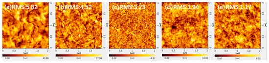 One of the necessary conditions for the preparation of highly efficient OSCs is the formation of a favorable surface morphology. We used an AFM to study the surface morphology of active layers with different D: A ratios. It is well known that the degree of phase separation of the active layer plays a crucial role in determining the exciton dissociation, charge transport, and collection [36,37,38]. As is shown in Figure 4, fibrous characteristic structures can be observed in the active layers with different D: A ratios, which is the phenomenon of developing phase separation. When the D: A ratio was varied from 1.0:1.2 to 0.2:1.2, the corresponding root-mean-square (RMS) roughness increased from 1.17 nm to 5.82 nm. These results indicate that with the continuous decrease in PM6 in the active layer, the surface morphology of the PM6:Y6 blended film is negatively affected. This revealed that stronger aggregation of the Y6 acceptor appeared in the active layer as the PM6 content decreased, leading to reduced binding at the donor–acceptor interface [39]. It can be seen that, as the PM6 content decreases, the absorption of the PM6:Y6 hybrid film appears to decrease from 400 nm to 620 nm as well as the higher roughness, which together lead to a reduction in device efficiency.