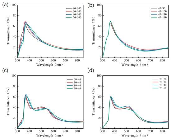 The experimental transmittance spectrum of (a) glass/ag (15 nm)/CBP (20–50 nm)/LiF (100 nm); (b) glass/ag (15 nm)/CBP (40 nm)/LiF (90–120 nm); (c) glass/ag (15 nm)/CBP (40 nm)/LiF (100 nm)/CBP (60–90 nm)/LiF (40 nm); (d) glass/ag (15 nm)/CBP (40 nm)/LiF (100 nm)/CBP (70 nm)/LiF (20–40 nm).
