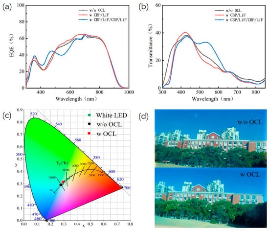 The EQE spectra and transmission spectra of ST-OSCs based on a two-layer OCL and a four-layer OCL are shown in Figure 8a,b. The ST-OSCs with CBP/LiF/CBP/LiF showed a decrease in the range of 450–600 nm and an increase in the near-infrared region in EQE. The ST-OSCs with CBP/LiF showed an increase in EQE in the 450–1000 nm range. The transmission spectra are in agreement with the simulated results. Figure 8c shows the CIE coordinates of ST-OSCs with and without CBP/LiF/CBP/LiF. The results show that the CIE coordinates of the ST-OSCs with the OCL are closer to the white light region, showing good neutral colors. As can be seen in Figure 8d, the picture of ST-OSCs with an OCL is significantly brighter and more natural. It can be clearly seen that the PCE of ST-OSCs can be slightly improved from 10.65 to 10.87% using an optimized OCL compared to ST-OSCs without an OCL. What is impressive is the significant increase in AVT from 22.78 to 27.61% for ST-OSCs with an OCL.