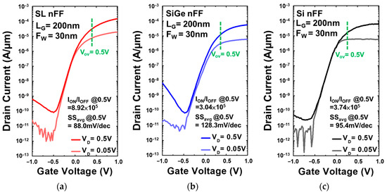 Figure 7 and Figure 8 compare the characteristics of drain current (ID) versus gate voltage (VG) curves for Si0.8Ge0.2/Si SL, Si0.8Ge0.2, and Si FinFET devices with HfO2 = 4 nm/TiN = 80 nm, Fin width (Fw) = 30 nm, and gate length (LG) = 200 nm for both P-type (Figure 7a–c) and N-type (Figure 8a–c). The Si0.8Ge0.2/Si SL FinFETs exhibit the lowest SSavg,P = 93.3 mV/dec, SSavg,N = 88.0 mV/dec atc, where SS was extracted from every adjacent measured point. Due to the strain effect of the super-lattice structure, the Si0.8Ge0.2/Si SL FinFET has the highest ION and reflects on the high ION/IOFF of approximately 106. The ID is normalized by the footprint width, and VTH is extracted at a constant ID of 10−7 A/µm. ION is extracted at VOV = VD = ±0.5 V. All electrical characteristics were determined using Keithley 4200A at room temperature.