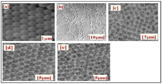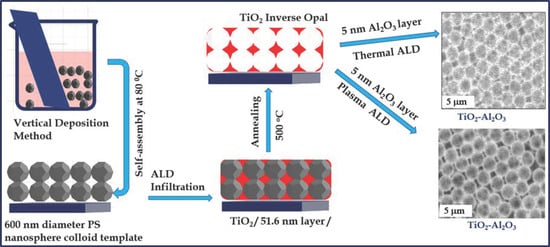 In fabricating the IO structures, a bottom-up approach is the most popular synthetic technique. This process passes through three different successive steps: (a) the deposition of a colloid crystal template on top of the substrate; (b) filling the nanosphere’s voids with the precursors of high-dielectric materials [,]; and (c) removing the original opal template using wet chemical etching and calcination in the case of SiO2 and polymer templates, respectively [,]. Additionally, techniques such as atomic layer deposition (ALD) [,], sol–gel [,], and hydrothermal methods [,] could be used for infiltration purposes. However, due to the extremely small void area between nanospheres, conventional infiltration processes, including chemical vapor deposition (CVD) and sol–gel, have limitations in completely infiltrating oxides in the voids of the template []. Since the aforementioned approaches have limitations in the infiltration of the voids, approaches such as ALD have been recently proposed to reverse these and associated effects.