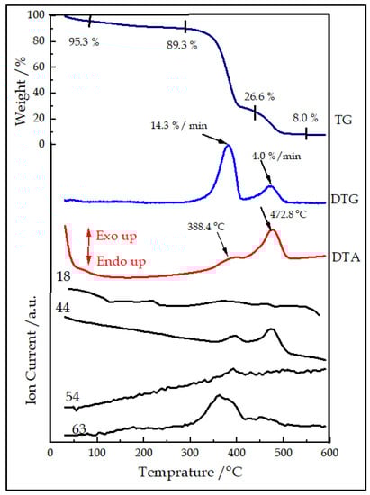 The thermal analysis of the PS opal template showed that annealing at 600 °C was an effective technique to remove the template (Figure 2). It was observed that the template was thermally stable up to about 100 °C, with only an evolution of solvent (mass to charge ratio, m/z = 18, 4.6% mass loss). The TG/DTG curves showed two main stages (300–425 and 425–500 °C) of decomposition combined with the exothermic burning of the organic material. The first step was explained by the decomposition and combustion of the main part of the sacrificial polymer precursors, while the second step was the result of the burning of the remaining char. Based on the measurement, 500 °C was adequate as an annealing temperature to remove the polymer opal template and produce the IO structure. This also corroborated to Worzakowska [] and Manikandan et al. [].