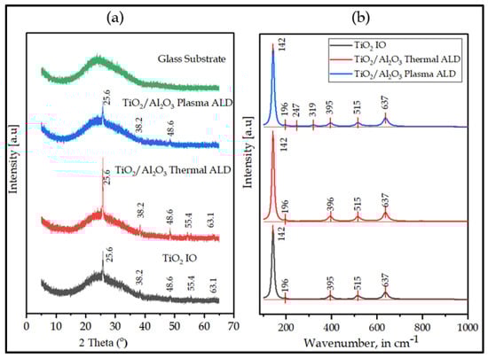 The crystalline structure of the samples was characterized by both XRD and Raman (Figure 4a,b). The major XRD peaks were shown at 25.6°, 38.2°, 48.6°, 55.4°, and 63.1°, corresponding to TiO2 tetragonal anatase phase (ICCD card number: 98-009-2363). Similar results were reported by Yew et al. []. Hence, the annealing temperature (500 °C) was sufficient to crystallize the amorphous TiO2 to a stable anatase phase, which corroborated Chakraborty et al. []. Due to their trace amounts, the 5 nm Al2O3 layers synthesized by thermal or plasma ALD on IO were not enough to yield the XRD signal in the analysis, especially as the as-grown Al2O3 were expected to be amorphous. The crystal structure of the IO has not been altered by the thin Al2O3 layer grown by thermal ALD. In contrast to the thermal ALD, after the plasma reaction, peaks at 25.6°, 38.2°, and 48.6° were observed only, which resulted in a decrease in the peak intensity and crystallinity of the double layer. In addition, the broad diffraction band with no peaks between 20° and 30° is a typical soda lime glass used as a substrate.