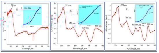 The pure TiO2 and its nanocomposite IO samples showed a sharply increased absorption intensity at shorter wavelengths with absorption edges of 330, 320, and 335 nm for TiO2, thermal, and plasma Al2O3 ALD-grown double-layer nanocomposites, respectively, as indicated in Figure 5a–c. Therefore, these strong edges of absorption amplified the extent of the light absorption due to the slow photon effects, i.e., light propagation at reduced group velocity, [,], evaluation through electronic transitions, and generating electron–hole pairs necessary for photocatalytic processes. The composite samples exhibited absorption edges in the visible region corresponding to 470, 630, and 800 nm of the thermal and 490, 610, 672, and 800 nm, of the plasma ALD samples, respectively. These sinusoidal absorption patterns in the vis region were comparable to the layer thickness and also the presence of Al2O3 ALD ultra-thin films in combination with an energy band gap (3.6 eV and 3.8 eV).